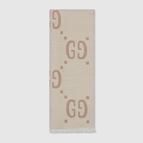 Los códigos emblemáticos de la Firma y los motivos sofisticados se reinterpretan en clave contemporánea para la colección Pre-Fall. Este suave fular está confeccionado en seda de lana y jacquard con GG y exhibe un delicado ribete con flecos.