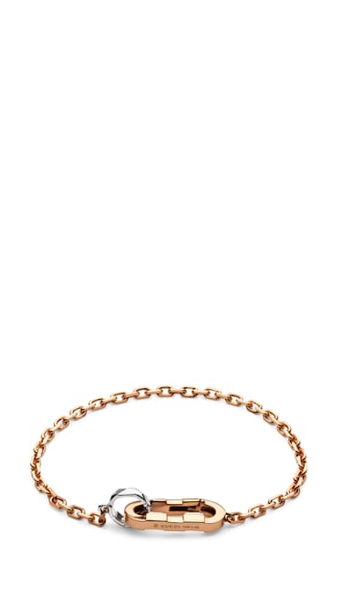 Gucci präsentiert Halsketten, Armbänder und Ringe aus 18-karätigem Weiß-, Rosé- oder Gelbgold in verschiedenen Größen und Ausführungen: mit Nieten oder neuen Kettengliedern, glatter Oberfläche sowie mit Diamanten besetzt. Mit ihrer achteckigen Form sind die Ringe ein Symbol für Unendlichkeit und eröffnen einzeln oder übereinander getragen zahlreiche Styling-Optionen.