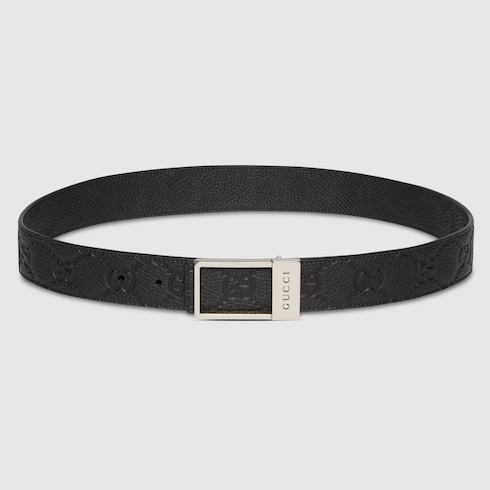 Herrengürtel mit rechteckiger Schnalle erscheinen in einem wendbaren Design, das ein charakteristisches Motiv des Hauses auf der einen Seite mit Leder in neutralen Farben auf der anderen Seite kombiniert. Dieses Modell aus genarbtem GG Leder und Glattleder zeichnet sich durch eine rechteckige Schnalle mit Gucci Gravur aus.