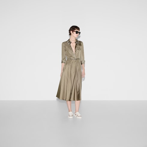 El motivo GG, inspirado en el monograma del fundador Guccio Gucci, sigue siendo uno de los favoritos de la Firma. En este caso, se muestra en un vestido de sarga de seda con un ribete y una hebilla de Doble G que aporta una mayor definición a la silueta.