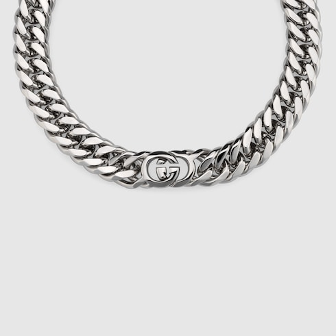 Gucci Interlocking fashion jewelry introduces the emblematic motif as a functional magnetic closure. This gourmette chain necklace features the Interlocking G which opens for effortless wearability.