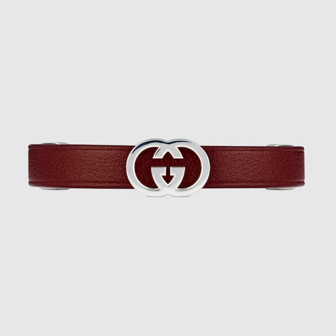 Die Gucci Interlocking Linie wird für Pre-Fall 2025 um elegante Lederarmbänder mit einem GG Detail aus Sterlingsilber erweitert. Diese Variation aus Glattleder in Rosso Ancora Rot ist mit einem praktischen Schiebeverschluss versehen.