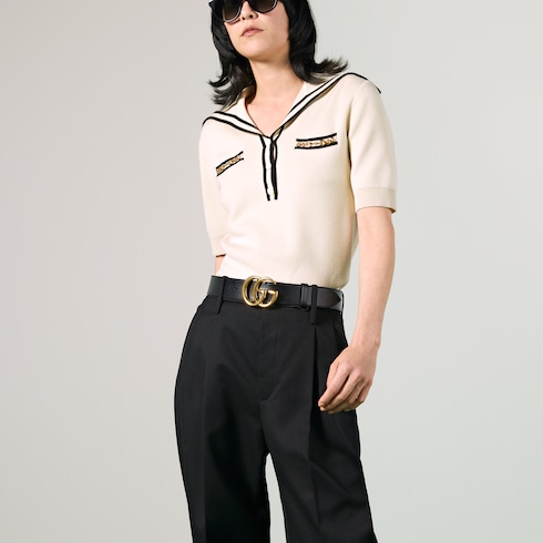 Revisité dans une teinte dorée lumineuse, le Double G emblématique fait son grand retour dans la collection Printemps-Été 2020. Il vient ici orner une ceinture en cuir lisse noir pour homme.