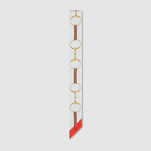 I motivi storici della Maison risplendono su nuove stampe accattivanti. Questo nastro in seta GG jacquard presenta una stampa Morsetto Gucci sul davanti, che testimonia l'ispirazione della Maison al mondo equestre.