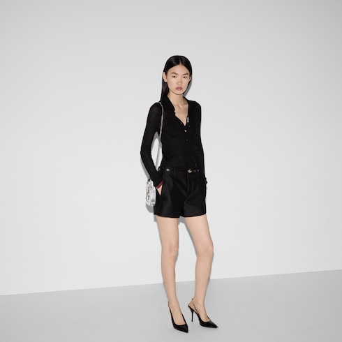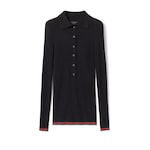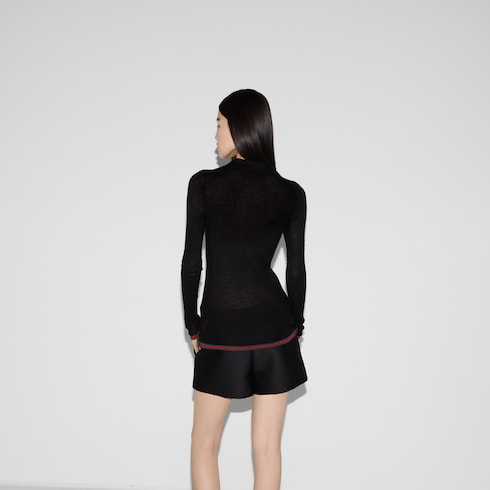 Les codes de la Maison évoluent encore pour la nouvelle saison sur les pièces décontractées en jersey. Confectionné dans un mélange de cachemire extra fin et soie côtelée, ce polo révèle un motif Gucci en intarsia et une finition bande Web vert et rouge sur les poignets et l’ourlet.