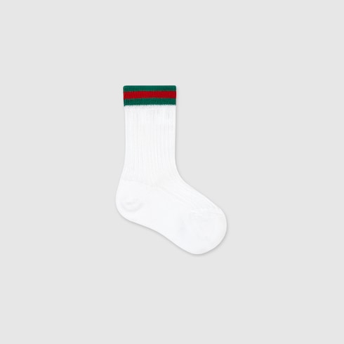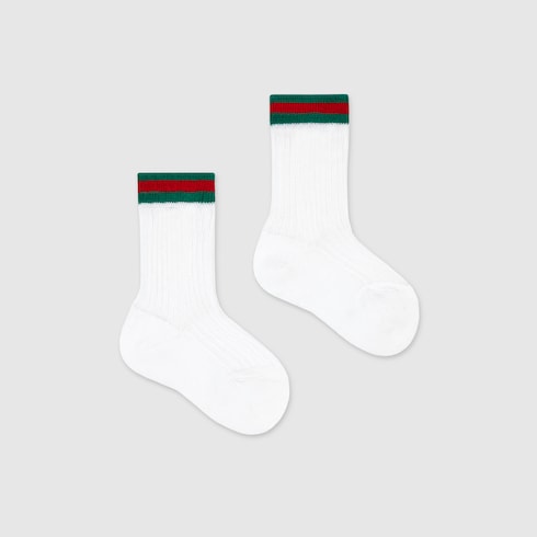 Das Web aus den Archiven rückt in der Cruise 2025 Kinderkollektion in verschiedenen Variationen in den Fokus. In Grün und Rot sorgt es als Besatz auf Ready-To-Wear-Modellen, Schuhen und Accessoires für sportliche Looks mit vielseitigem Charakter. Diese Babysocken aus Baumwolle werden von einem grünen und roten Web geziert.