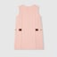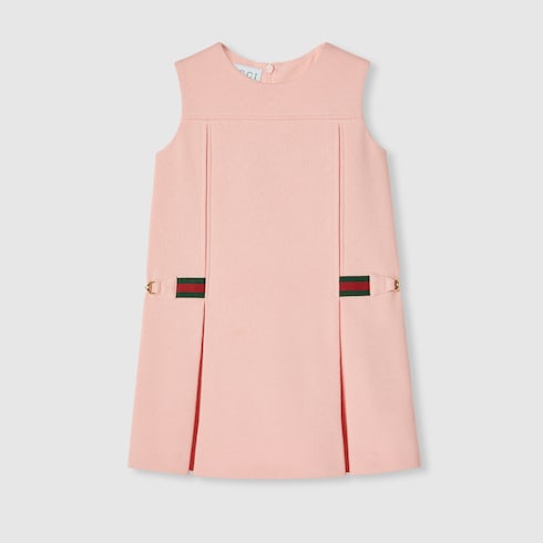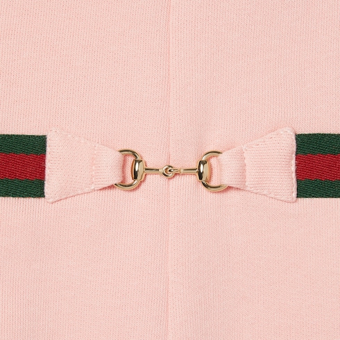 Das Web aus den Archiven rückt in der Cruise 2025 Kinderkollektion in verschiedenen Variationen in den Fokus. In Grün und Rot sorgt es als Besatz auf Ready-To-Wear-Modellen, Schuhen und Accessoires für sportliche Looks mit vielseitigem Charakter. Dieses Kinderkleid aus gefilztem Baumwolljersey wird von einem Web-Detail mit Horsebit in Taillenhöhe geziert.