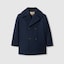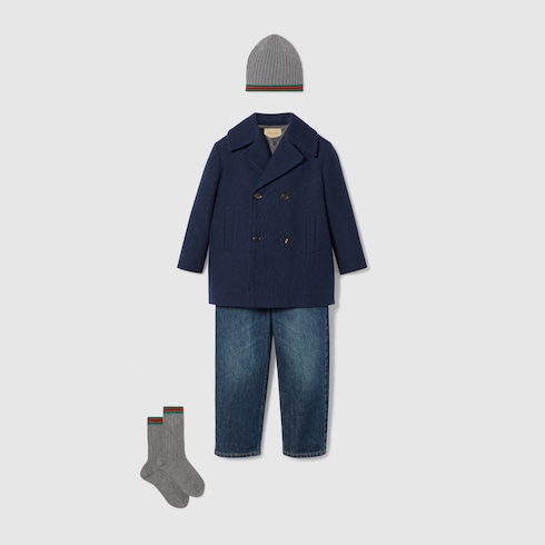La clásica tribanda Web continúa enriqueciendo la colección infantil de Gucci. El detalle de logotipo aporta un toque deportivo retro a la selección junto con el nombre de la Firma. Esta chaqueta de corte cuadrado está confeccionada en mezcla de lana azul oscuro y se caracteriza por un jacquard con tribanda Gucci. Un jacquard con Horsebit aporta un toque de luz al forro.