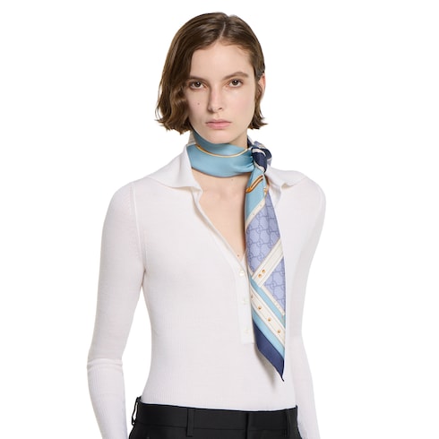 Los detalles de Horsebit y los motivos ecuestres en colores sofisticados rinden homenaje al vínculo de la Firma con el mundo ecuestre. Este pañuelo cuadrado se ha fabricado en sarga de seda con un estampado integral de Horsebit y cinturones.