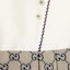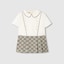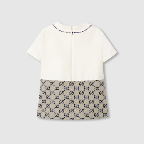 Dalle stampe ai dettagli ricamati, il nome e il logo della Maison sono proposti in diverse varianti su una selezione di accessori e capi ready-to-wear per la collezione Pre-Fall 2024. Questo abito per neonato è realizzato in voile di cotone bianco con gonna a pieghe in tessuto GG beige e blu. Le finiture smerlate aggiungono un tocco femminile alla silhouette.