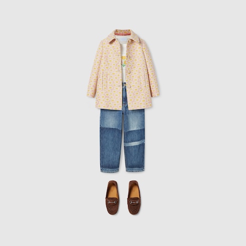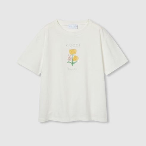 La creatrice e pittrice sudcoreana Naon Jeong crea disegni giocosi e nostalgici ispirati alla sua vita quotidiana e alla cultura coreana. Nella collezione bambini Cruise 2025, le sue stampe di gatti e altri motivi divertenti si combinano con il nome della Maison. Questa T-shirt oversize per bambini presenta una stampa floreale "dear me" Gucci e una stampa gatto "look at me" sul retro.