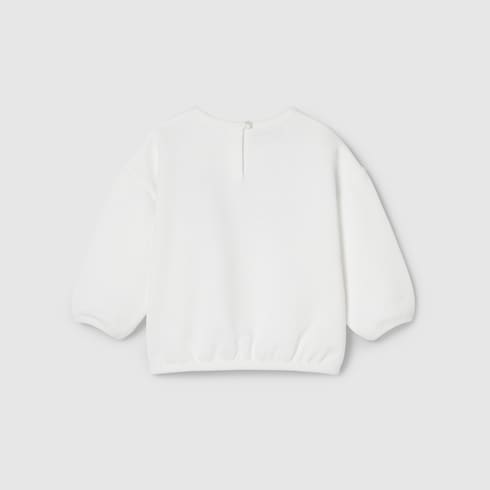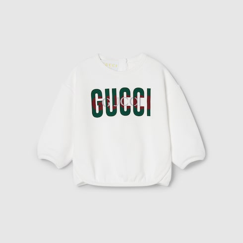 Das Web aus den Archiven rückt in der Cruise 2025 Kinderkollektion in verschiedenen Variationen in den Fokus. In Grün und Rot sorgt es als Besatz auf Ready-To-Wear-Modellen, Schuhen und Accessoires für sportliche Looks mit vielseitigem Charakter. Dieses Baby-Sweatshirt aus Baumwolljersey zeichnet sich durch einen Rundhalsausschnitt und einen Gucci Overlay-Print mit Web aus.