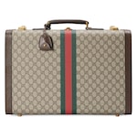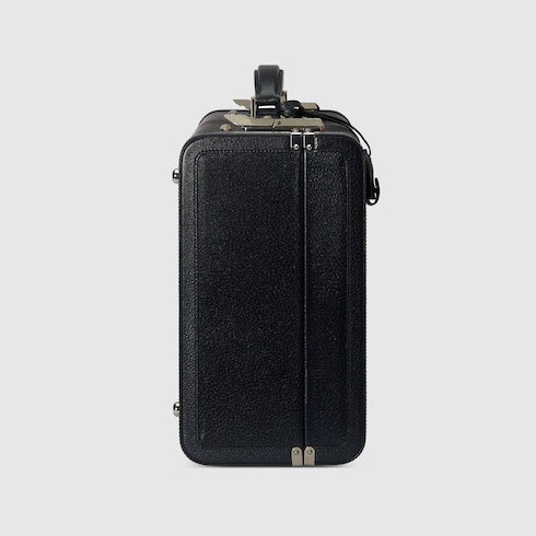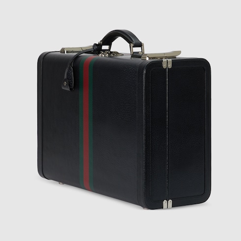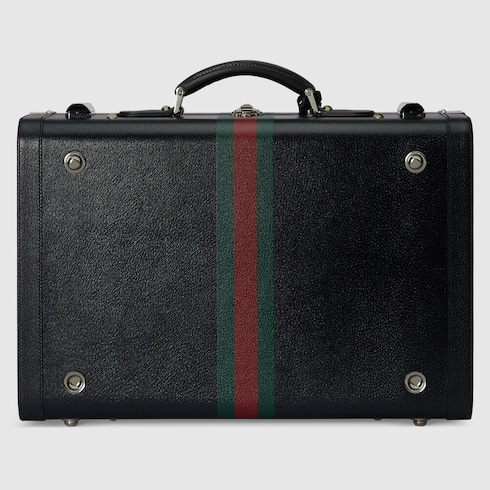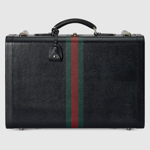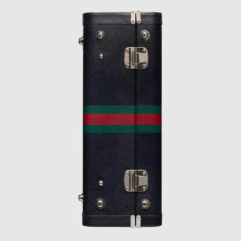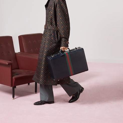 La línea Gucci Savoy presenta una nueva combinación de colores en azul oscuro. Este sofisticado y contemporáneo tono realza un accesorio de viaje versátil imprescindible en el fondo de armario para el día a día. El diseño de esta maleta se completa con la histórica tribanda Web en verde y rojo, y un aplique con acabado metalizado en paladio.