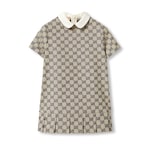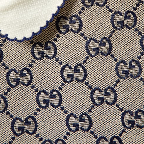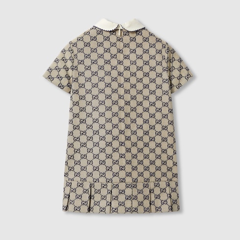 Des imprimés aux détails brodés, le nom et le logo de la Maison s’affichent sous différentes esthétiques sur une sélection de vêtements et d’accessoires pour la collection Pre-Fall 2024. Cette robe à la coupe épurée en toile GG beige et bleu est rehaussée d’un col Claudine contrastant.