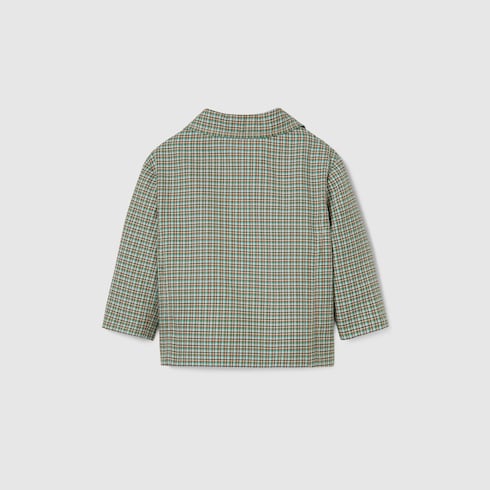 Von Prints bis Stickereien: Auf den Ready-To-Wear-Looks und Accessoires für Pre-Fall 2025 nehmen der Name und das Logo des Hauses vielfältige Formen an. Diese Babyjacke aus Baumwolle zieren ein Mikro-Karomuster und eine Gucci Stickerei.