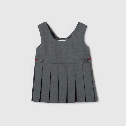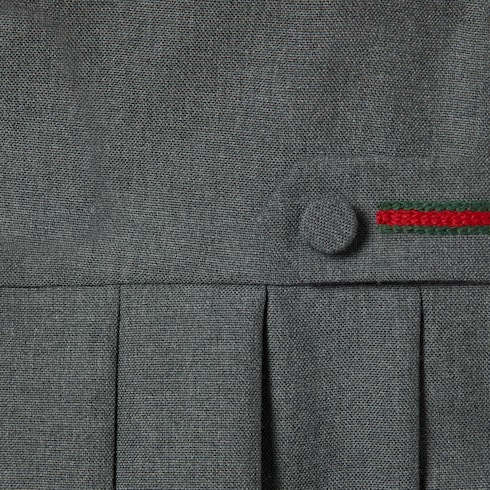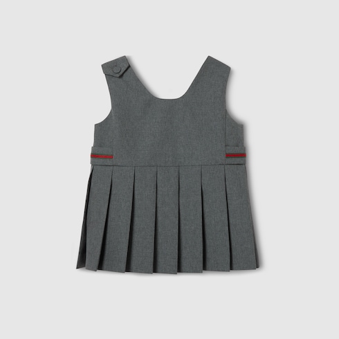 Das Web aus den Archiven rückt in der aktuellen Kinderkollektion in verschiedenen Variationen in den Fokus. In Grün und Rot sorgt es als Besatz auf Ready-To-Wear-Modellen, Schuhen und Accessoires für sportliche Looks mit vielseitigem Charakter. Dieses Wollkleid für Babys wird von einem gestickten Web-Detail in Taillenhöhe geziert.