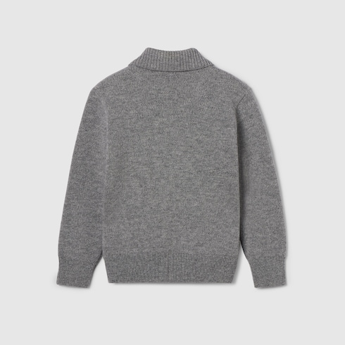Das Web aus den Archiven rückt in der aktuellen Kinderkollektion in verschiedenen Variationen in den Fokus. In Grün und Rot sorgt es als Besatz auf Ready-To-Wear-Modellen, Schuhen und Accessoires für sportliche Looks mit vielseitigem Charakter. Dieser Kinder-Cardigan mit Reißverschluss ist aus Wolle gefertigt und wird von einem Web-Detail an den Schultern geziert.