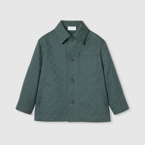 Im Rahmen der Pre-Fall 2025 Kinderkollektion rücken beliebte Motive in den Mittelpunkt, darunter auch charakteristische Logo-Details. Diese Kinderjacke aus GG Baumwollgabardine wird von Gucci Metallknöpfen komplettiert.