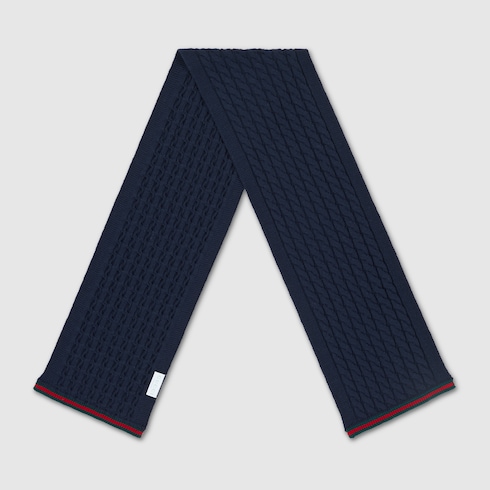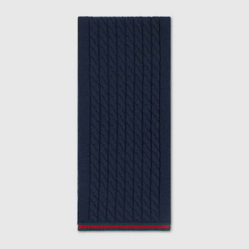 Das Web aus den Archiven rückt in der aktuellen Kinderkollektion in verschiedenen Variationen in den Fokus. In Grün und Rot sorgt es als Besatz auf Ready-To-Wear-Modellen, Schuhen und Accessoires für sportliche Looks mit vielseitigem Charakter. Auch dieser Kinderschal aus Wollstrick ist mit einem kontrastierenden Web-Besatz versehen.