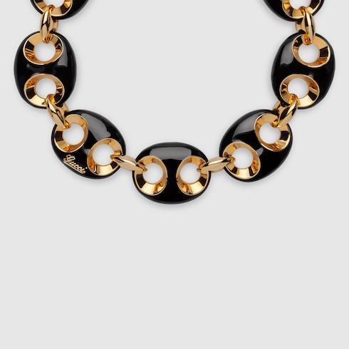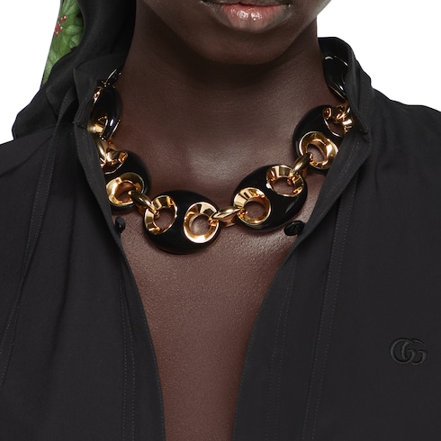 Das Marina Chain-Detail ist ein charakteristisches Design aus den 1960er-Jahren, das von der glamourösen Welt des Segelns inspiriert ist. Bei dieser Modeschmuck-Halskette wird es aus schwarzer Emaille und in Kombination mit dem Gucci Schriftzug präsentiert.