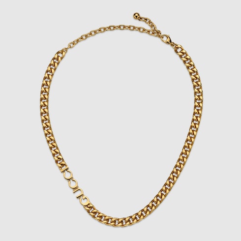 Die charakteristische Modeschmucklinie mit dem Gucci Schriftzug umfasst Halsketten und Armbänder mit neuem glänzendem Finish, bei denen der Name des Hauses als zentrales Detail in Form eines Anhängers oder Schmuckelements in Erscheinung tritt. Hier ziert der Gucci Schriftzug eine Gourmette-Halskette aus goldfarbenem Metall mit Schließe.