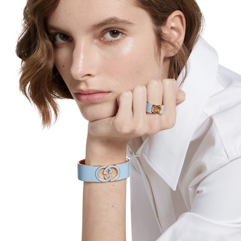 Cut-out-Details verleihen emaillierten Ringen aus der Gucci Interlocking Auswahl einen zeitgemäßen Charakter. Die Farbtöne sind dabei unverkennbar an die Ready-To-Wear-Looks für Pre-Fall 2025 angelehnt, so auch bei dieser Variation in Hellblau.