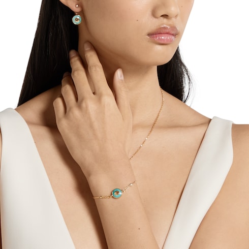 In der aktuellen Gucci Interlocking Linie kommt mit dem Amazonit ein Edelstein zum Einsatz, der für seine ausgleichende Wirkung bekannt ist. Für die neuen Designs wird die intensive Farbe des Steins in Kombination mit weißen Diamanten präsentiert, so auch bei diesem Kettenarmband mit GG Motiv.