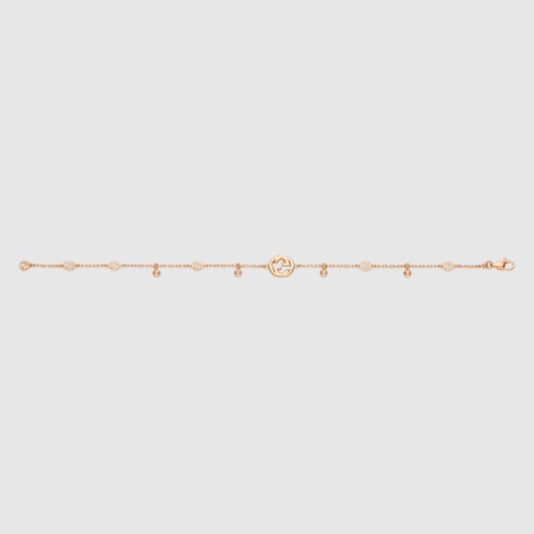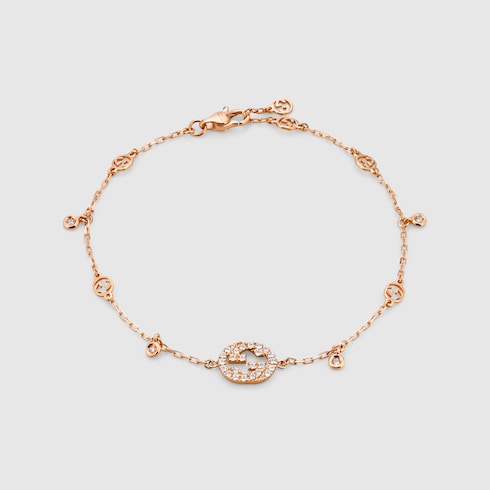Die Inspiration für die Gucci Interlocking Schmuckkollektion stammt vom geometrischen Logo des Hauses. Die Designs reichen von überkreuz gearbeiteten Armbändern und Pavé-Ringen mit GG bis hin zu Einzelohrringen, Creolen mit GG und mit Diamanten besetzten Ohrsteckern aus glattem Gelb- oder Roségold. Dieses Armband mit Diamanten und GG ist sowohl tagsüber als auch am Abend ein Blickfang.