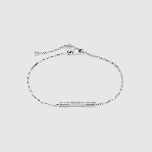 Die Link to Love Kollektion setzt sich auf zeitgemäße Weise mit dem Thema Romantik auseinander und bedient sich dabei neuer Liebessymbole. In der Kollektion werden verschiedene Goldtöne und Veredlungen kombiniert, wodurch die Grenzen zwischen Männlich und Weiblich verschwimmen. Jedes Teil bietet eine Vielzahl von Trage- und Kombinationsmöglichkeiten, sodass die individuelle Persönlichkeit ungehindert Ausdruck finden kann. Dieses Armband aus 18-karätigem Weißgold hat einen Stabanhänger mit Diamant-Pavé.