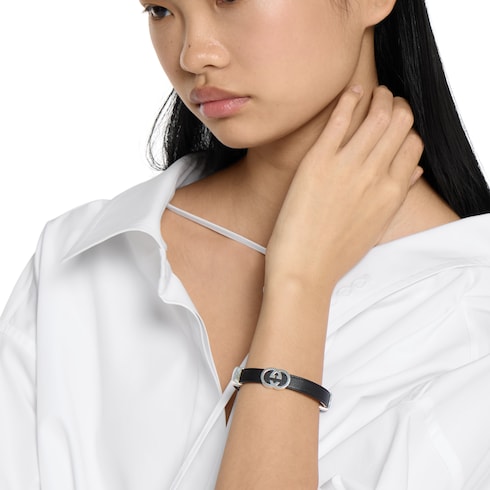 Die Gucci Interlocking Linie wird für Pre-Fall 2025 um elegante Lederarmbänder mit einem GG Detail aus Sterlingsilber erweitert. Diese Variation aus schwarzem Glattleder ist mit einem praktischen Schiebeverschluss versehen.