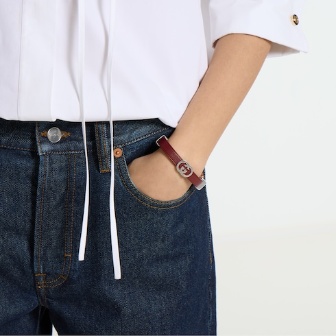 Die Gucci Interlocking Linie wird für Pre-Fall 2025 um elegante Lederarmbänder mit einem GG Detail aus Sterlingsilber erweitert. Diese Variation aus Glattleder in Rosso Ancora Rot ist mit einem praktischen Schiebeverschluss versehen.