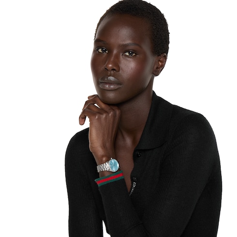 Ikonische Motive des Hauses erhalten in den neuesten Kollektionen der G-Timeless Linie ein farbliches Statement. Diese Uhr mit Quarzwerk hat ein Armband aus Edelstahl und ein blaues Zifferblatt.