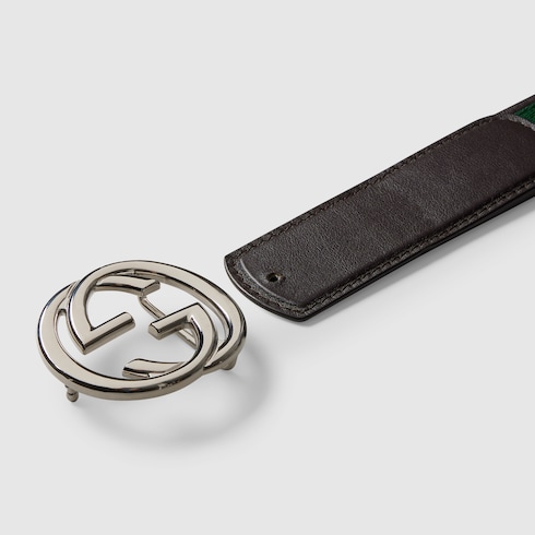 Dieser wendbare Gürtel aus der Herbst Winter 2025 Kollektion kombiniert das grüne und rote Web mit dunkelbraunem Leder und einer abnehmbaren GG Schnalle.