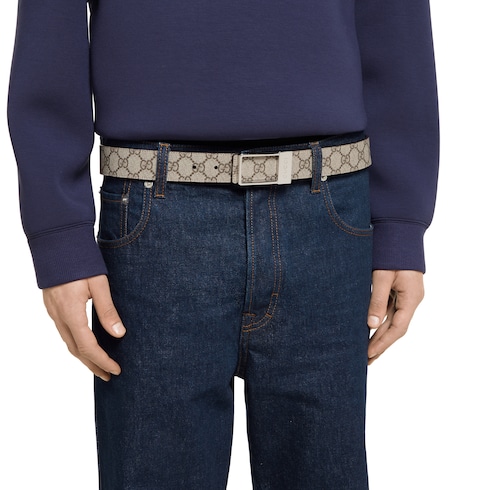 Herrengürtel mit rechteckiger Schnalle erscheinen in einem wendbaren Design, das ein charakteristisches Motiv des Hauses auf der einen Seite mit Leder in neutralen Farben auf der anderen Seite kombiniert. Dieses Modell aus GG Supreme und Glattleder zeichnet sich durch eine rechteckige Schnalle mit Gucci Gravur aus.