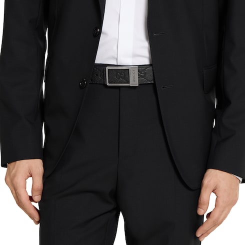 Herrengürtel mit rechteckiger Schnalle erscheinen in einem wendbaren Design, das ein charakteristisches Motiv des Hauses auf der einen Seite mit Leder in neutralen Farben auf der anderen Seite kombiniert. Dieses Modell aus genarbtem GG Leder und Glattleder zeichnet sich durch eine rechteckige Schnalle mit Gucci Gravur aus.
