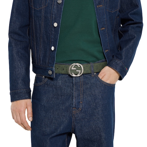 In der Herbst Winter 2025 Kollektion wird mit dem beschichteten GG Monogramm-Stoff ein unverkennbares Motiv des Hauses neu in Szene gesetzt. Hier erscheint es auf einer Seite dieses wendbaren Gürtels. Die andere Seite besteht aus farblich abgestimmtem, grünem Leder. Eine abnehmbare GG Schnalle setzt einen weiteren besonderen Akzent.