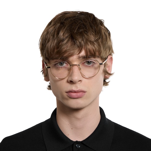 Die Eyewear-Looks aus der Pre-Fall 2025 Kollektion umfassen elegante Silhouetten mit dem charakteristischen Web an den Bügeln. Dieses runde Brillengestell kombiniert ein Design aus hellgoldfarbenem Metall mit einem Web-Detail, einem gravierten Gucci Logo und Bügelenden in dunkelbrauner Schildpatt-Optik.