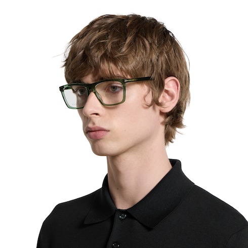 Die Brillen aus der Pre-Fall 2025 Kollektion kombinieren begehrte Silhouetten aus vergangenen Jahrzehnten mit einem zeitgemäßen Logo-Look. Bei diesem Modell trifft ein Rahmen aus transparent-grünem Azetat auf das Gucci Logo.