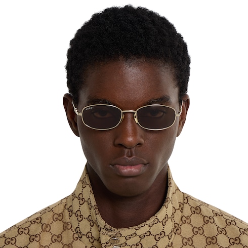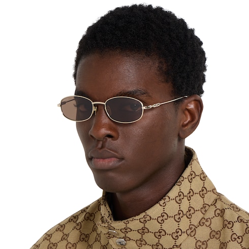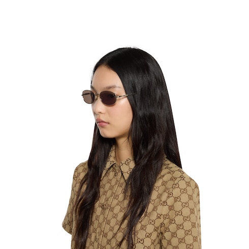 Für die Eyewear-Looks aus der Pre-Fall 2025 Kollektion verschmelzen Statement-Silhouetten aus den Archiven mit zeitgemäßen Elementen. Diese ovale Sonnenbrille ist in einem Design aus hellgoldfarbenem Metall gehalten und mit einem Gucci Cut-out-Logo versehen.