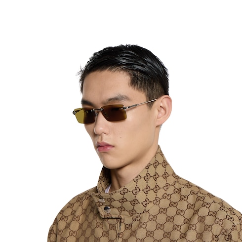 Für die Eyewear-Looks aus der Pre-Fall 2025 Kollektion verschmelzen Statement-Silhouetten aus den Archiven mit zeitgemäßen Elementen. Diese rechteckige Sonnenbrille ist in einem Design aus silberfarbenem Metall gehalten und mit einem Gucci Cut-out-Logo versehen.