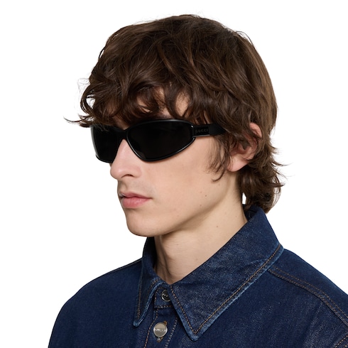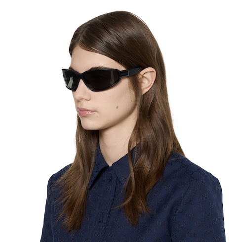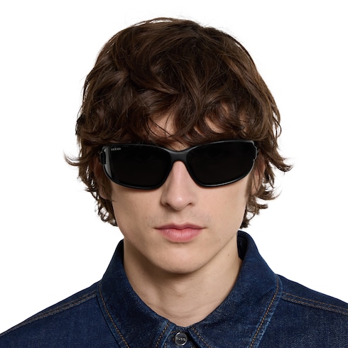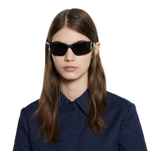 Für die Eyewear-Looks aus der Kollektion verschmelzen formvollendete Silhouetten und charakteristische Motive zu zeitgemäßen Designs. Diese rechteckige Sonnenbrille wird von einer Metallplakette mit graviertem Gucci Logo an den schwarzen Spritzgussbügeln geziert.
