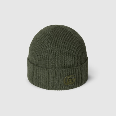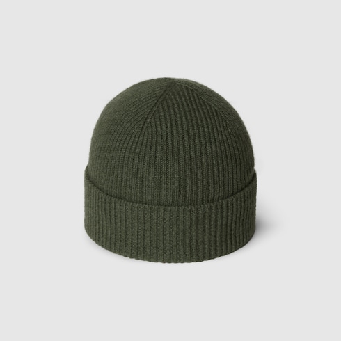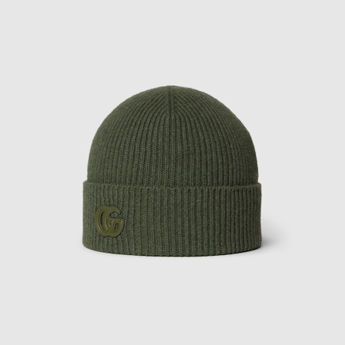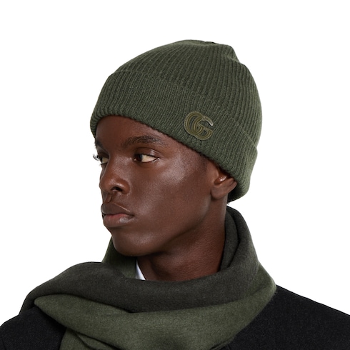 Die Accessoires aus weichen Stoffen und Seide aus der Pre-Fall 2025 Kollektion hauchen bekannten Codes des Hauses durch raffinierte Besätze, Logo-Patches und dezente Stickereien neues Leben ein. So wird diese Mütze aus dunkelgrünem Kaschmir von einem Doppel G Patch aus Leder ergänzt.