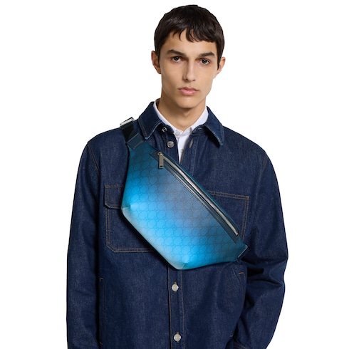 Ein Print mit Farbverlauf-Effekt in erfrischendem Blau lässt essenzielle Silhouetten in einem neuen Licht erscheinen. Diese Gürteltasche ist aus beschichtetem GG Monogramm-Stoff mit durchgehendem Farbverlauf-Print gefertigt.