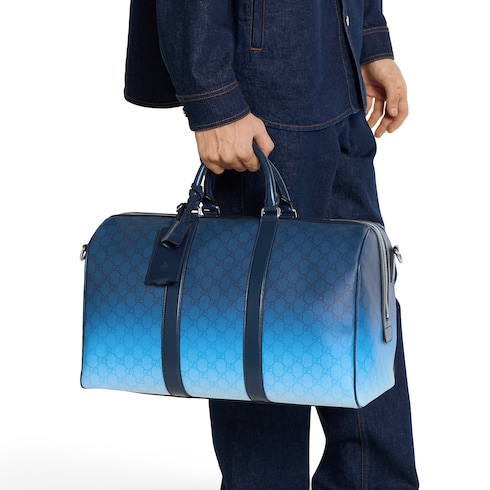 Ein Print mit Farbverlauf-Effekt in erfrischendem Blau lässt essenzielle Silhouetten in einem neuen Licht erscheinen. Diese Reisetasche ist aus beschichtetem GG Monogramm-Stoff gefertigt und verfügt über einen durchgehenden GG Print mit Farbverlauf.