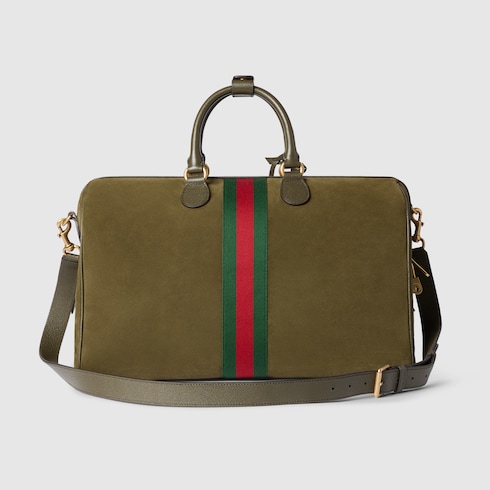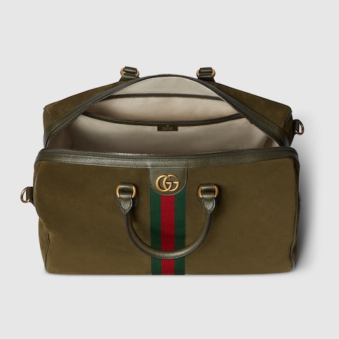 Im Rahmen der Herbst Winter 2025 Kollektion kombiniert die Gucci Savoy Linie Designs aus Wildleder mit Lederbesätzen, wodurch ein faszinierendes Zusammenspiel von Textur und Tiefe entsteht. Auch bei dieser Reisetasche, die vom symbolträchtigen Web des Hauses in Kombination mit dem Doppel G akzentuiert wird, sorgen die edlen Materialien für einen zeitlos eleganten Charakter.