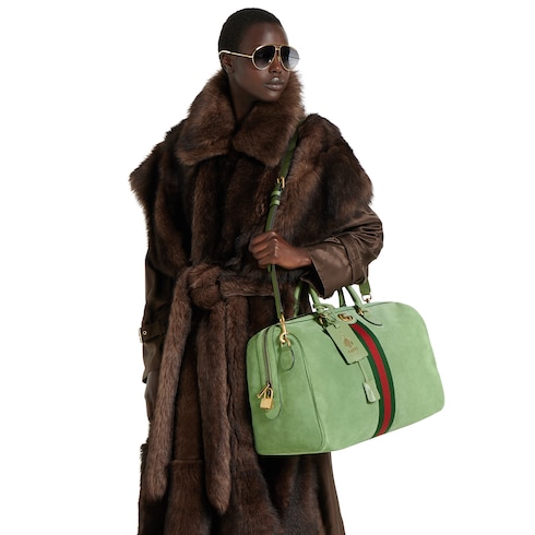 Im Rahmen der Herbst Winter 2025 Kollektion kombiniert die Gucci Savoy Linie Designs aus Wildleder mit Lederbesätzen, wodurch ein faszinierendes Zusammenspiel von Textur und Tiefe entsteht. Auch bei dieser Reisetasche, die vom symbolträchtigen Web des Hauses in Kombination mit dem Doppel G akzentuiert wird, sorgen die edlen Materialien für einen zeitlos eleganten Charakter.