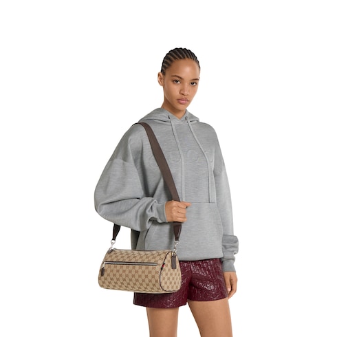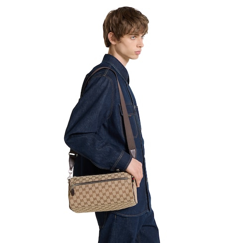 Die Herrentaschen aus der Pre-Fall 2025 Kollektion vereinen klare Linien mit traditionsreichen Symbolen. Dieser Artikel ist aus beigefarbenem und braunem GG Canvas gefertigt und wird von einem grünen und roten Web-Detail komplettiert.