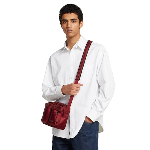 Das leichte und strapazierfähige GG Nylon kehrt in neuen Designs und Farben zurück ins Rampenlicht. Hier kommt es bei einer Umhängetasche zum Einsatz, die von einem grünen und roten Web-Detail geziert wird.
