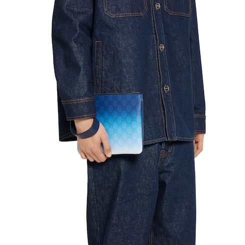 Ein Print mit Farbverlauf-Effekt in erfrischendem Blau lässt essenzielle Silhouetten in einem neuen Licht erscheinen. Diese Pouch ist aus beschichtetem GG Monogramm-Stoff mit durchgehendem Farbverlauf-Print gefertigt.