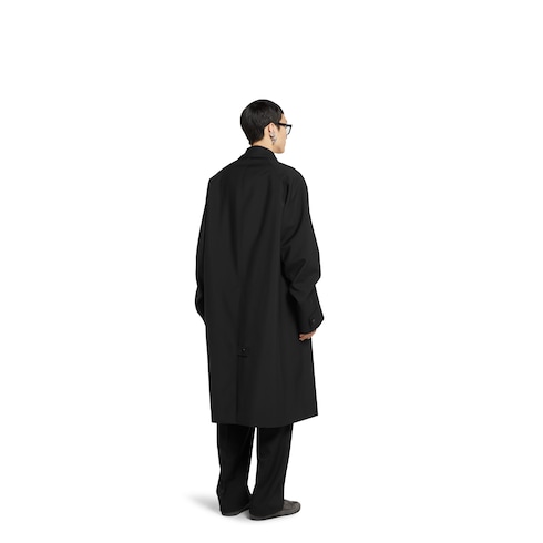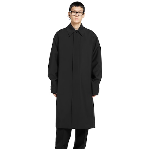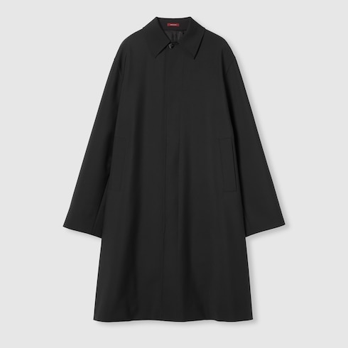 Die Pre-Fall 2025 Kollektion umfasst Designs in gedeckten Schwarz-, Grau- und Grüntönen, auf denen zarte Blumen-Stickereien, geprägte Logos und andere aufwendig gearbeitete Details auf besondere Weise in den Fokus rücken. Dieser Mantel aus schwarzer, gebondeter Wolle wird von einem geprägten Gucci Logo unter dem Kragen geziert.